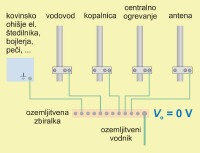 Z medsebojno povezavo kovinskih ohišij električnih naprav ter prevodnih delov vodovodnih, toplovodnih in drugih instalacij z ozemljenim kovinskim vodnikom, onemogočimo možnost nevarnih napetosti med njimi ter med njimi in tlom.