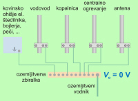 V elektroenergetiki povežemo med seboj kovinska ohišja električnih naprav ter prevodne dele vodovodnih, toplovodnih in drugih instalacij z vodnikom, ki je ozemljen (sl. 1.5.3.5.1). Tako ohišjem naprav in prevodnim delom inštalacij zagotovimo enak električni potencial 0 V in onemogočimo nevarne napetosti med njimi v slučaju, če bi zaradi okvare katere od naprav, njeno ohišje pridobilo visok električni potencial. Nekaj več bomo o tem zvedeli pri obravnavi zaščite človeka pred nevarnostmi dotikov kovinskih delov hišnih inštalacij, ki bi lahko bili na nevarnih električnih potencialih.