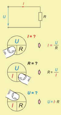 Enostavno pomoč pri »izvajanju« navedenih enačb ponuja slika kroga U-I-R.