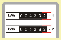 Slika prikazuje številčnici dvotarifnega števca na začetku in koncu