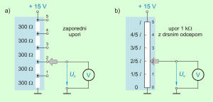 Elektronsko krmiljenje npr. jakosti zvoka pri ojačevalnikih, števila vrtljajev npr. pri vrtalnikih, temperature ogrevanja, jakosti svetlobe, ... najpogosteje temelji na signalu o omenjenih količinah v obliki ročno nastavljive električne napetosti. Kot bomo ugotovili, lahko takšno napetost zagotovimo tudi z deljenjem napetosti oziroma z delilniki napetosti. Nekaj primerov iz prakse, kjer »zadaj tiči« tak delilnik napetosti, prikazuje sl. 3.2.2.3.5.1.