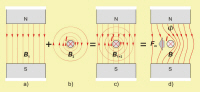 in skupno magnetno polje trajnega magneta in električnega toka (d). |