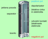 Pozitivna elektroda in hkrati depolarizator alkalnega člena (slika 7.2.2.2.1) je manganov oksid MnO2, elektrolit pa je kalijev lug (KOH). Negativna elektroda je želatini podobna zmes elektrolita in cinkovega prahu. Elektroda iz medenine, ki se nahaja v cinkovi želatini, predstavlja le odvodni kontakt negativne elektrode.